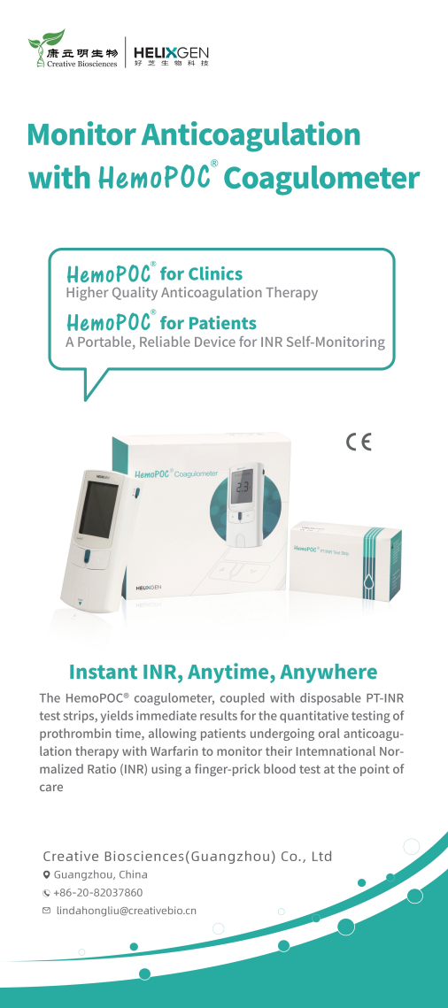 此外,康立明全資子公司好芝生物產品HemoPOC®凝血檢測系統也將亮相此次檢驗盛會。HemoPOC®凝血檢測儀是一款便攜式凝血檢測設備,與配套的檢測卡組成。HemoPOC®凝血檢測系統,用于定量測定新鮮指尖毛細血管血的凝血酶原時間。該系統操作簡單(凝血檢測操作視頻),滿足即時檢測及床旁檢測的應用需求,增強抗凝管理和慢病管理的有效性。
