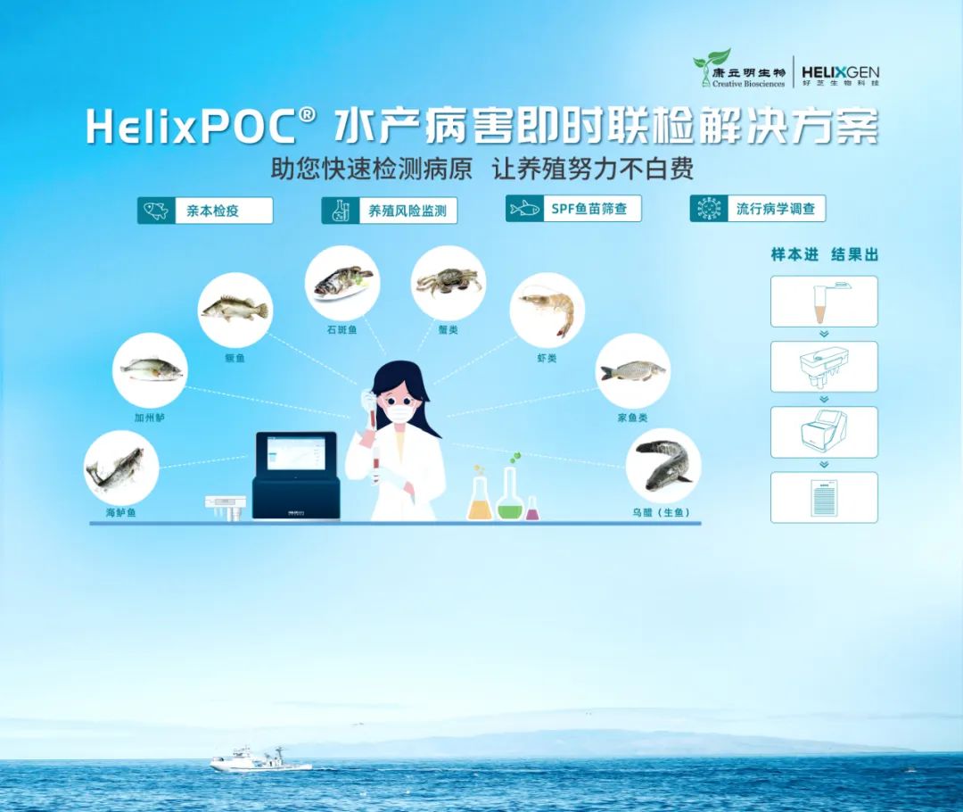 好芝生物以水產(chǎn)養(yǎng)殖病害防治為切入點,以養(yǎng)殖物種為檢測服務(wù)單元,提出水產(chǎn)病害即時聯(lián)檢解決方案。產(chǎn)品基于HelixPOC®全自動微流控核酸檢測一體機、水產(chǎn)病害核酸檢測試劑盒,針對水產(chǎn)不同細分種類的病害,實現(xiàn)樣本進、結(jié)果出的全自動化流程,無需專業(yè)操作人員及實驗室,滿足現(xiàn)場快速需求,面向規(guī)?;?、集約化的水產(chǎn)養(yǎng)殖基地、種苗基地、水產(chǎn)檢測中心等場景。檢測水產(chǎn)養(yǎng)殖物種涵蓋南美白對蝦、羅氏沼蝦、克氏原螯蝦、小龍蝦、青蟹、鱖魚、加州鱸、海鱸魚、石斑魚、金鯧魚、草魚、烏鱧、鯽魚等 。